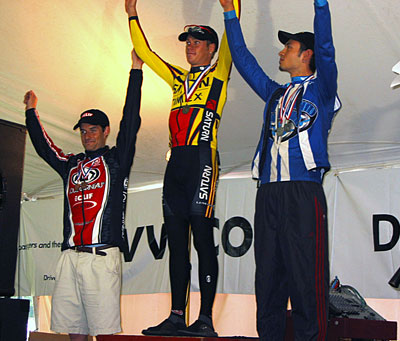 close. I take a few deep breaths to try and calm myself down. As I come through mile 5.5 I am greeted by a blast of wind, fog, and rain. Conditions just went from bad to UGLY! The winds are now blowing 30-40 mph but they are now more of a side/head wind! Visibility is about 30 feet, and taking your hands off the handlebars to grab some water was not an option! With the wind and my 23 I am really starting to bog down. I am having trouble getting my heart rate up and I begin to think this climb is never going to end. I hit mile 7 and the weather has continued to get worse. Winds are blowing 50mph and I can barely see anything in front of me now. Keeping the bike tracking straight is really an issue. I hit the 22% grade at the finish and my legs are about to explode. I can feel my rear tire slipping on the super slick pavement, but I make it to the top and finish. What an incredible ride! Conditions at the top are CRAZY. Within a minute of stopping I am freezing cold. It had to be 45 degrees up there! Crystal runs over and gives me some warm dry clothes to put on. I finished in a time of 1:01:40 and was 4th place overall. I was the 3rd Male so I made the podium presentation! The race will be televised this Thursday night (August 21st) on OLN. Thanks for reading, Andrew Knight |